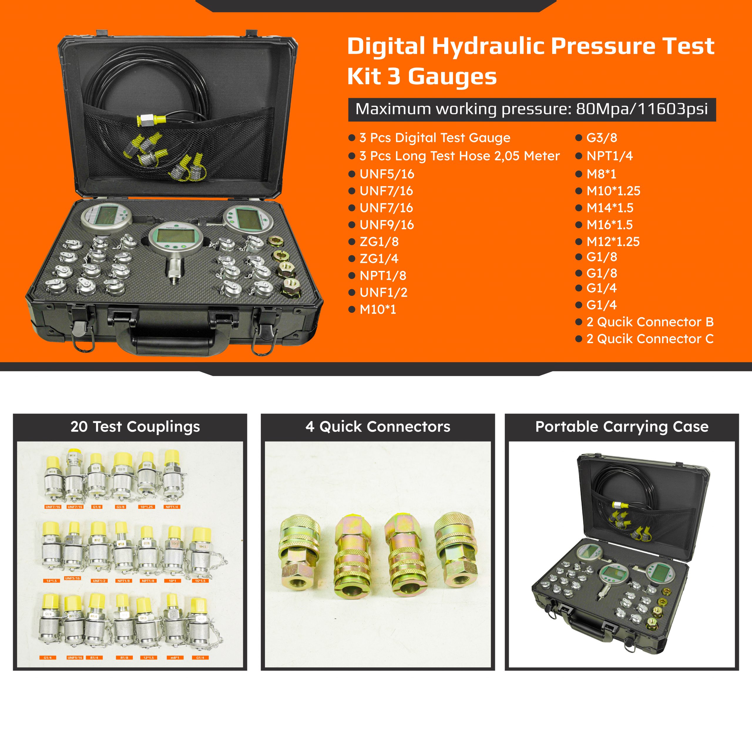 • 3 Digital Pressure Gauges: Max 11603PSI/80Mpa • 20pcs Interchangeable Test Couplings: • 2,05 Meter Long Test Hose |